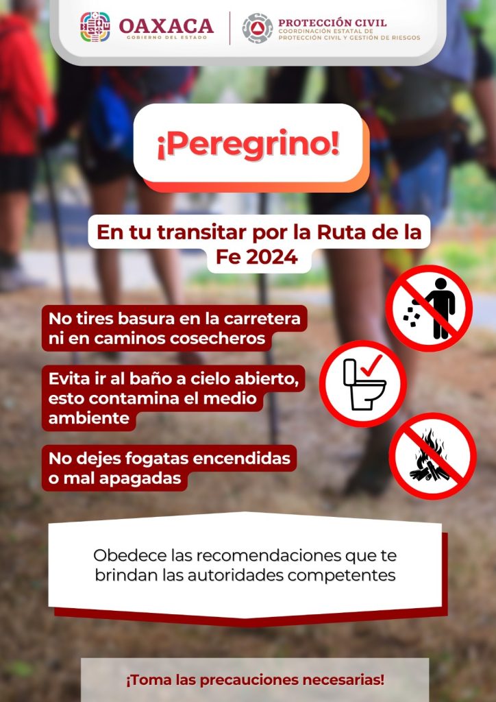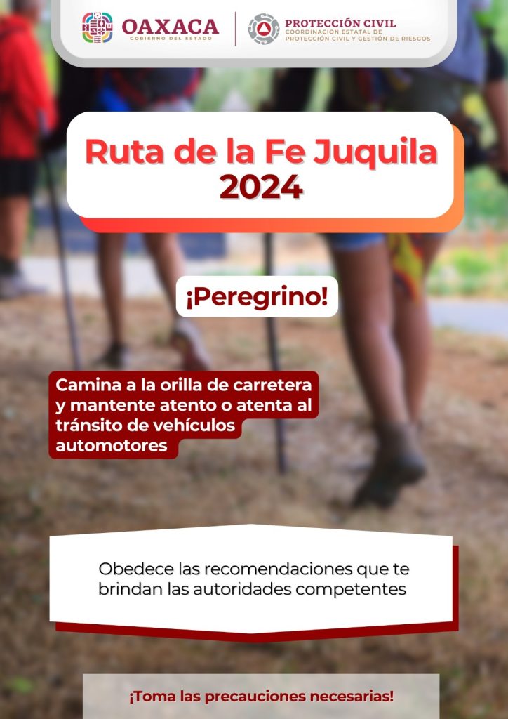Del 5 al 8 de diciembre, personal del área de Respuesta Inmediata de la dependencia, debidamente identificada, trabaja en diferentes puntos de la Ruta de la Fe -que abarca las regiones de Valles Centrales, Sierra Sur y Costa- para brindar información preventiva, así como algunas recomendaciones para el cuidado de las y los visitantes durante su tránsito a pie o en vehículo por la Carretera 131 que conduce a ese lugar.