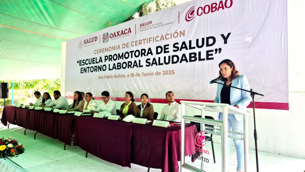 Oaxaca de Juárez, Oax., 8 de julio de 2025.- Como parte de la estrategia integral para fomentar entornos escolares con bienestar, Servicios de Salud de Oaxaca (SSO) a través de la Jurisdicción Sanitaria 1 Valles Centrales, certificó al Colegio de Bachilleres del Estado (COBAO) Plantel San Pablo Huitzo como Escuela Promotora de la Salud y Entorno Laboral Saludable, siendo el primer centro de educación media superior en el estado en obtener la distinción.