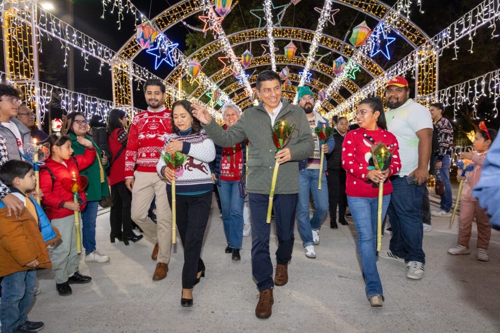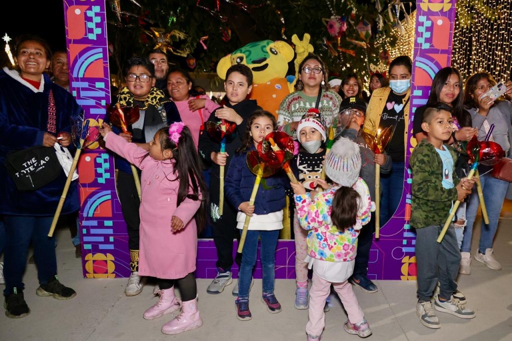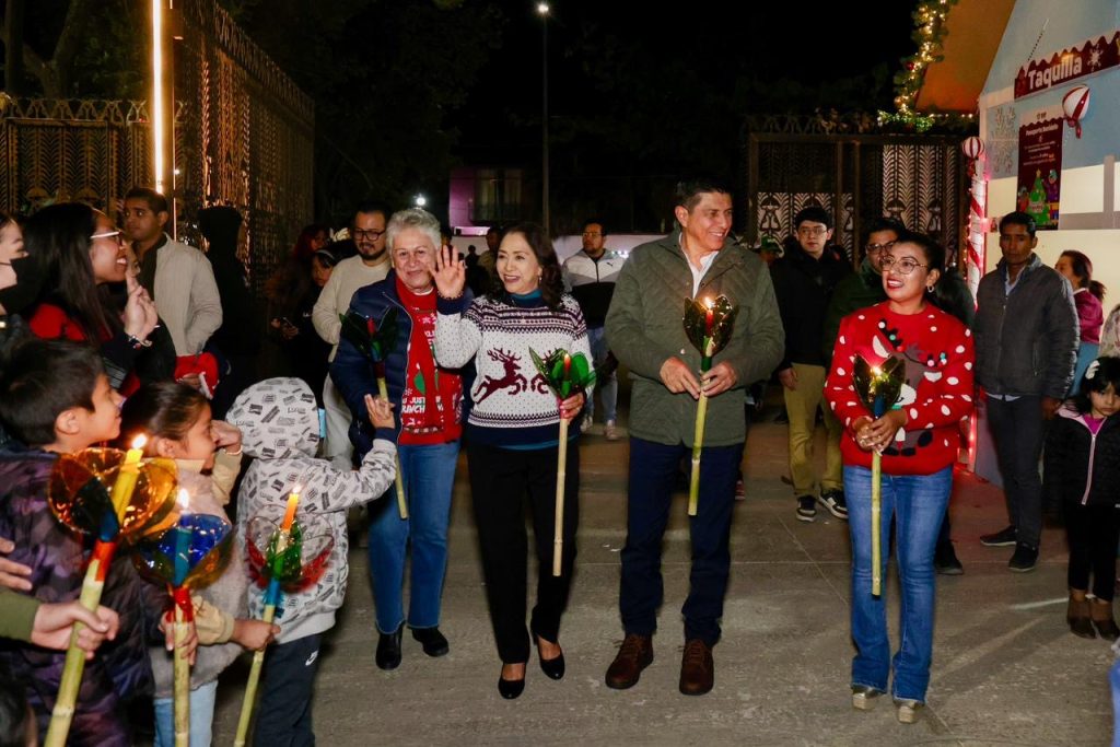 Con la tradicional posada, la niñez y adolescencia junto a sus seres queridos vivieron la magia de las fiestas decembrinas al coincidir en el tradicional recorrido con los faroles que iluminaron los pasillos que conducían al evento oficial donde se compartieron los villancicos Rodolfo El Reno y Feliz Navidad, este segundo interpretado en zapoteco de la Sierra Sur.