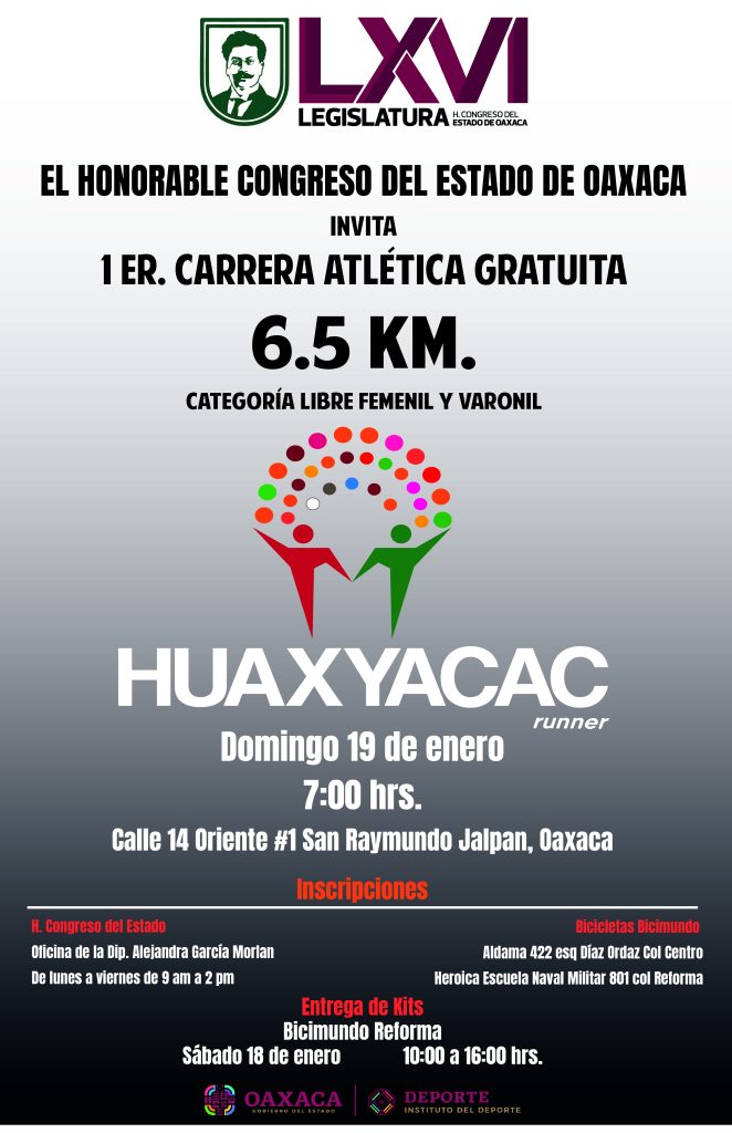 San Raymundo Jalpan, Oax., a 13 de enero de 2025.- Para fomentar la unión y participación de la comunidad oaxaqueña mediante la actividad deportiva, el Congreso del Estado a través de la Comisión Permanente del Deporte y el Instituto del Deporte del Gobierno estatal invitan a la población a participar de manera gratuita a la primera Carrera Atlética “Huaxyacac”, que se llevará a cabo el próximo 19 de enero.
