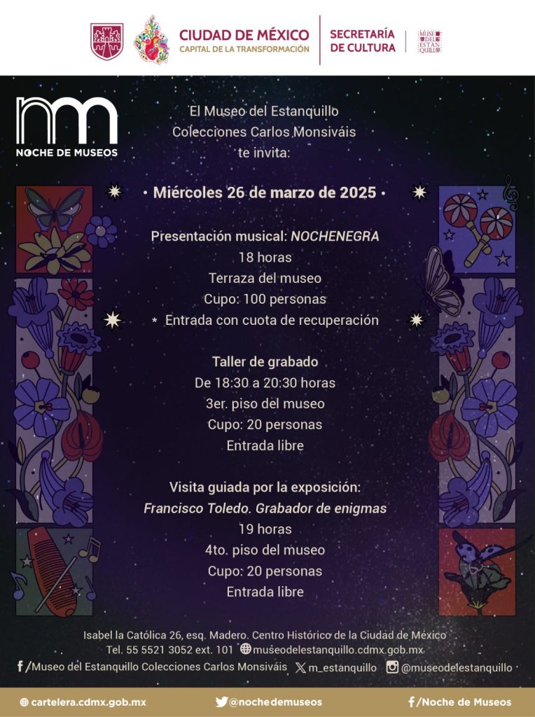 Para conocer todas las actividades de Noche de Museos, visita sus redes sociales en https://www.facebook.com/nochedemuseos.