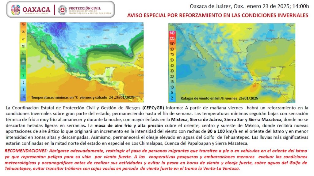 Oaxaca de Juárez, Oax. 23 de enero de 2025.- La Coordinación Estatal de Protección Civil y Gestión de Riesgos (#CEPCyGR) informa que, a partir de este viernes, habrá un reforzamiento en las condiciones invernales sobre gran parte del estado, las cuales permanecerán hasta el fin de semana.