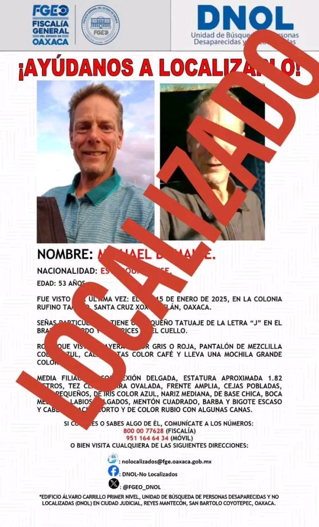El primer caso se trata de una persona del sexo masculino identificada como Michael D., de nacionalidad estadounidense quien, de acuerdo a la denuncia, fue visto por última vez el 15 de enero de 2025, en el municipio de Santa Cruz Xoxocotlán.