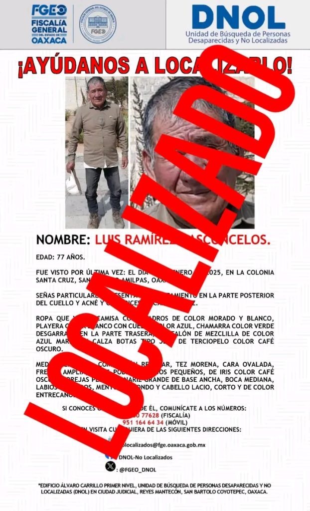 Ante la denuncia por ausencia, se activaron los protocolos de actuación en la investigación y búsqueda de personas desaparecidas y no localizadas, lo cual permitió trazar las líneas de investigación que llevaron a su localización el 17 de enero de 2025, en inmediaciones de Lomas del Crestón, jurisdicción del municipio de Oaxaca de Juárez.