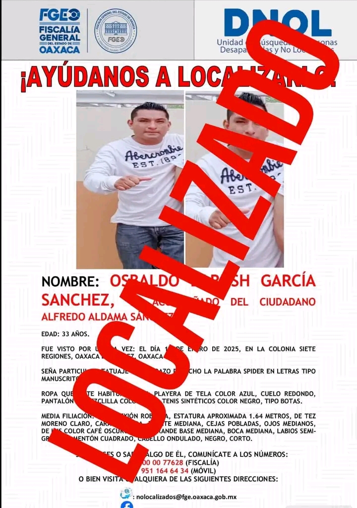 En tanto que, el tercer caso se trata de una persona del sexo masculino identificado como R.L.S., quien fue visto por última vez el 16 de enero de 2025, al salir de su domicilio ubicado en el barrio San Sebastián, en el municipio de Cuilapam de Guerrero, a partir de lo cual se realizaron los trabajos que permitieron su localización.