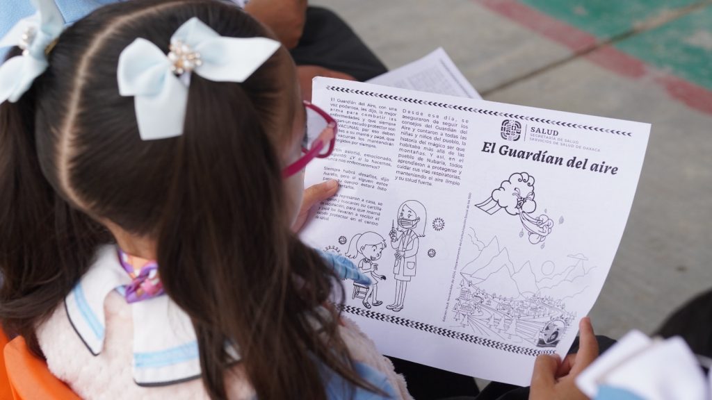 Asunción Nochixtlán, Oax. 21 de octubre de 2024.- En un lugar llamado Nubaria, existía un ser mágico: “El Guardián del Aire”, que portaba una capa hecha de nubes, y a través de una aventura les enseñó a las y los niños a cuidar su sistema de defensa con la aplicación de las vacunas, con un cuento que leyó en voz alta el Encargado de Despacho de los Servicios de Salud de Oaxaca (#SSO), Efrén Emmanuel Jarquín González.