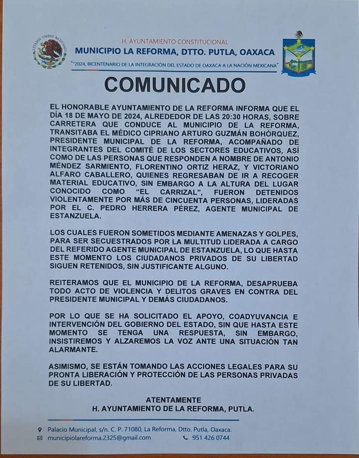 Dejaron claro que el Presidente Municipal de la Reforma lo retuvieron en el tramo denominado el Carrizal, donde lo emboscaron cincuenta ciudadanos y fue arrastrado hacia Estanzuela. Los integrantes del Ayuntamiento piden atender el caso y ellos están en la mejor disposición para resolver este problema e indican que tienen la voluntad de solución y que pueden asistir abiertamente a una mesa de negociación con el Gobernador del Estado de Oaxaca, Salomón Jara Cruz.