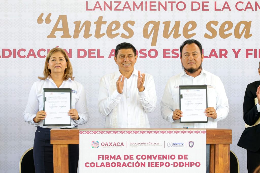 Teniendo como sede la escuela secundaria federal José María Bradomín, la administración estatal, a través del Instituto Estatal de Educación Pública de Oaxaca (IEEPO), firmó un convenio de colaboración para trabajar en coordinación con la Defensoría de los Derechos Humanos del Pueblo de Oaxaca (DDHPO), para lograr estos objetivos.