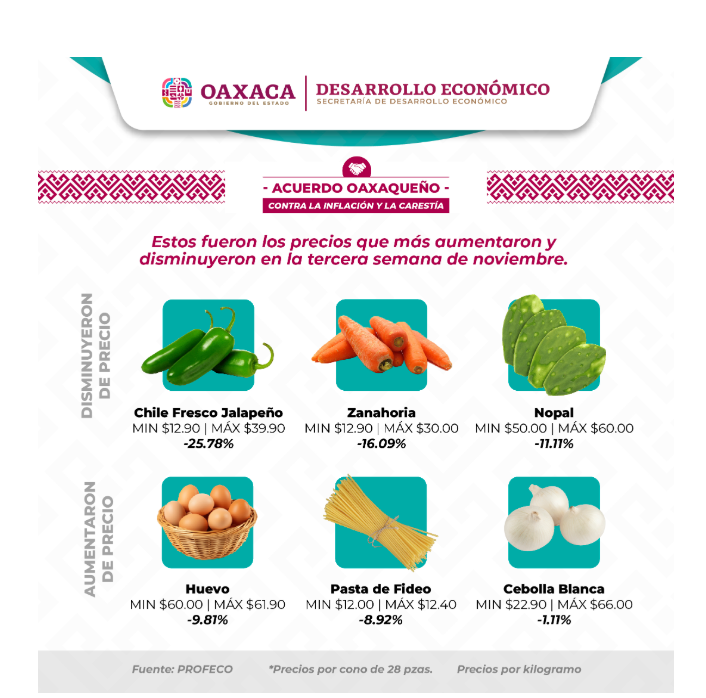 • Mediante la liga https://seie.oaxaca.gob.mx/canasta se informará los cambios en el costo de los 24 alimentos seleccionados y considerados en listados de Profeco, Banxico y Coneval