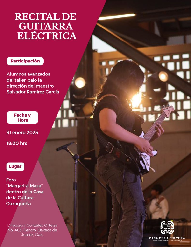 Asimismo, bajo la dirección del maestro Salvador Ramírez García, las alumnas y alumnos más avanzados del taller de guitarra eléctrica presentarán un recital el 31 de enero a las 18:00 horas, en el foro «Margarita Maza Parada» de la CCO.