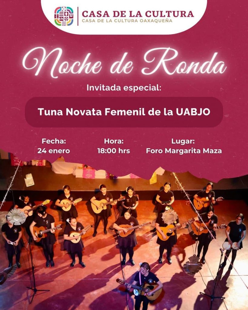 En ese mismo día también se presentará de manera gratuita una edición más del programa “Noche de Ronda” por parte de la Tuna Novata Femenil de la Universidad Autónoma Benito Juárez de Oaxaca (UABJO), en el Foro “Margarita Maza Parada” a las 18:00 horas.