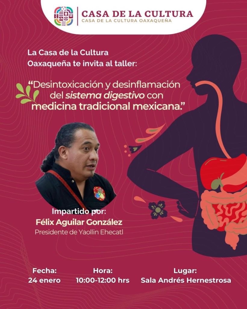 Mientras que, el viernes 24 de enero en punto de las 10:00 horas, la Sala Andrés Henestrosa será sede del taller “Desintoxicación y desinflamación del sistema digestivo con medicina tradicional mexicana”, cuyo propósito es compartir conocimientos sobre prácticas curativas tradicionales.