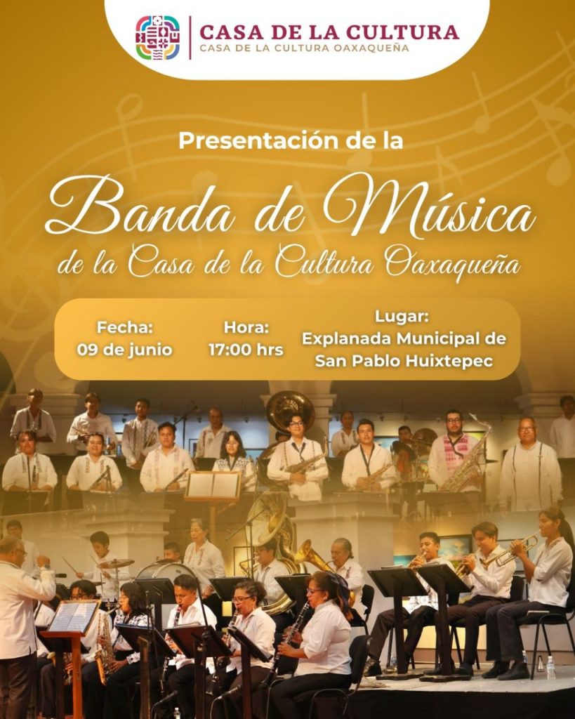 En el mismo recinto y fecha, la Banda de Música de la Casa de la Cultura Oaxaqueña se presentará a las 17:00 horas, en el marco de las celebraciones por la Fiesta Patronal del municipio.