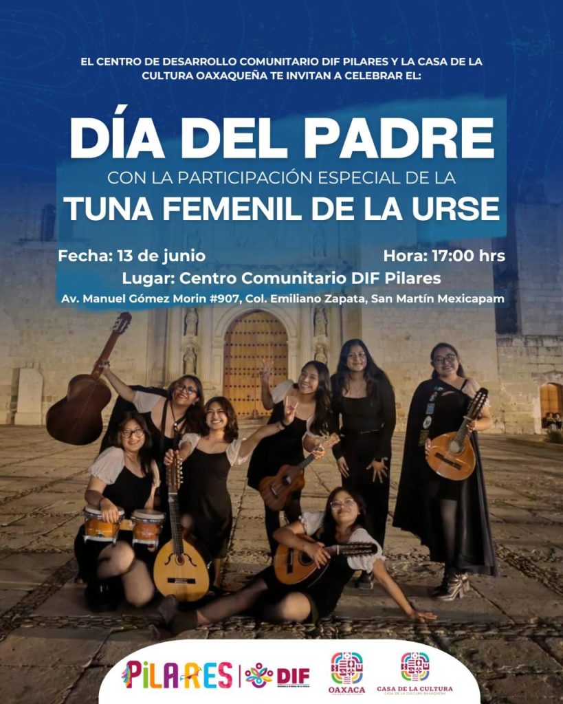 Finalmente, en el marco del Día del Padre, este 13 de junio, la dependencia ofrecerá una presentación especial a cargo de la Tuna Femenil de la Universidad Regional del Sureste, a las 17:00 horas, en el Centro de Desarrollo Comunitario DIF Pilares, para celebrar a los padres y abuelos oaxaqueños en compañía de sus hijas, hijos, nietas y nietos.