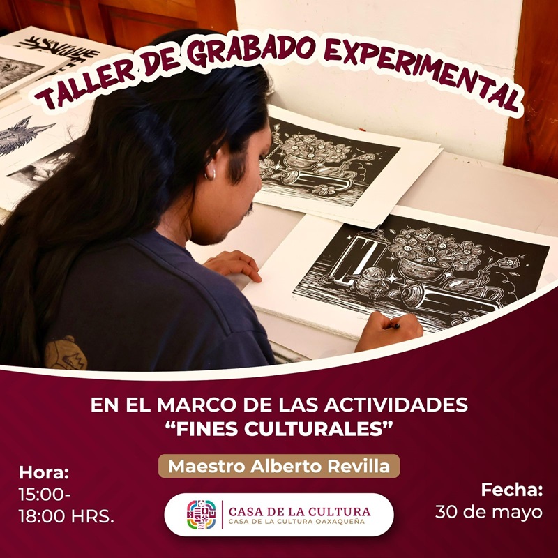 Asimismo, en el marco de las actividades “Fines Culturales”, el viernes 30 de mayo se impartirá el Taller de Grabado Experimental, a cargo del maestro Alberto Revilla, cuya entrada es libre.