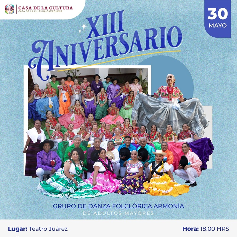 De igual manera, el sábado 31 de mayo, en el marco de su XIII Aniversario, el Grupo de Danza Folclórica “Armonía”, integrado por personas mayores, realizará una presentación con los bailes más representativos del estado.