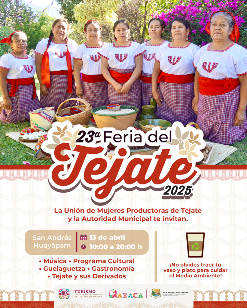 Oaxaca de Juárez, Oax. 12 de abril de 2025.- La Secretaría de Turismo (Sectur Oaxaca) invita a población y visitantes a disfrutar de la XXIII edición de la Feria del Tejate de San Andrés Huayápam, este domingo 13 de abril a partir de las 10:00 horas.