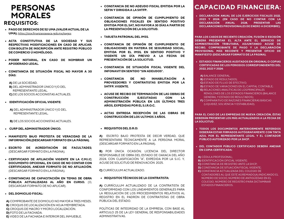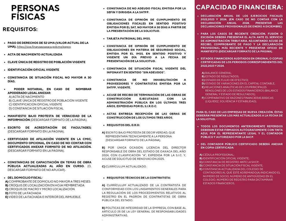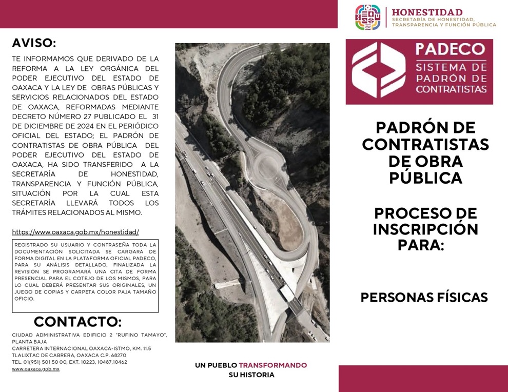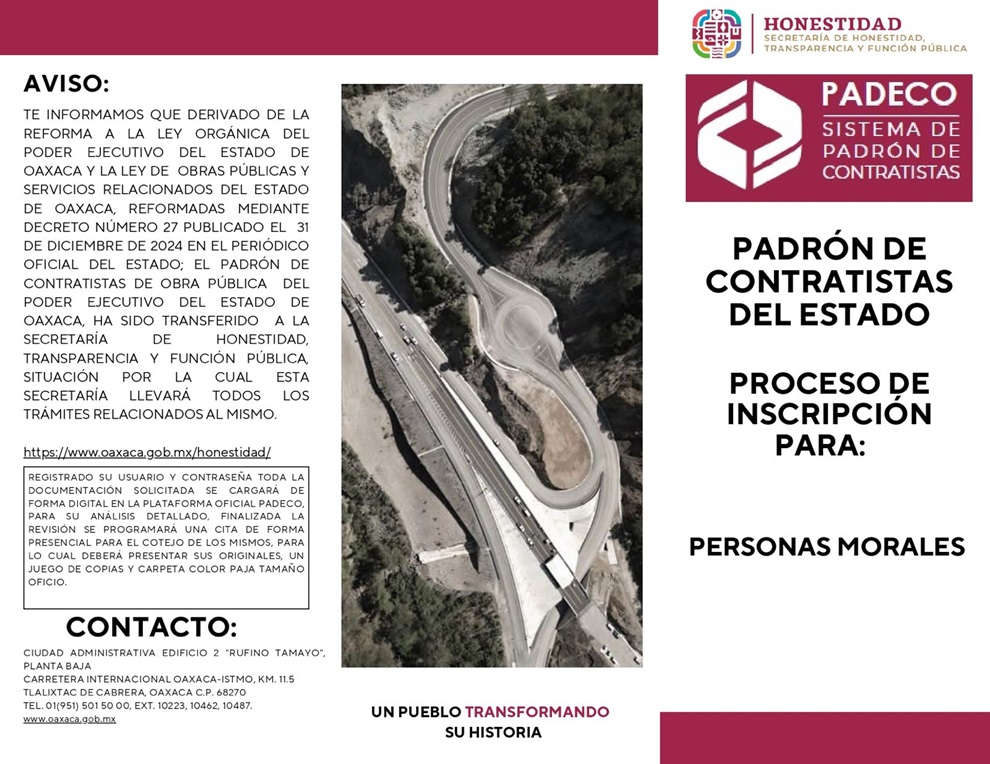 Tlalixtac de Cabrera, Oax. 31 de enero de 2025.- La Secretaría de Honestidad, Transparencia y Función Pública llevará a cabo los trámites relacionados con el Padrón de Contratistas de Obra Pública del Gobierno del Estado de Oaxaca que, por única ocasión en este 2025, la inscripción se deberá realizar en el sistema electrónico https://padeco.oaxaca.gob.mx/login y posteriormente, el pago de derechos.