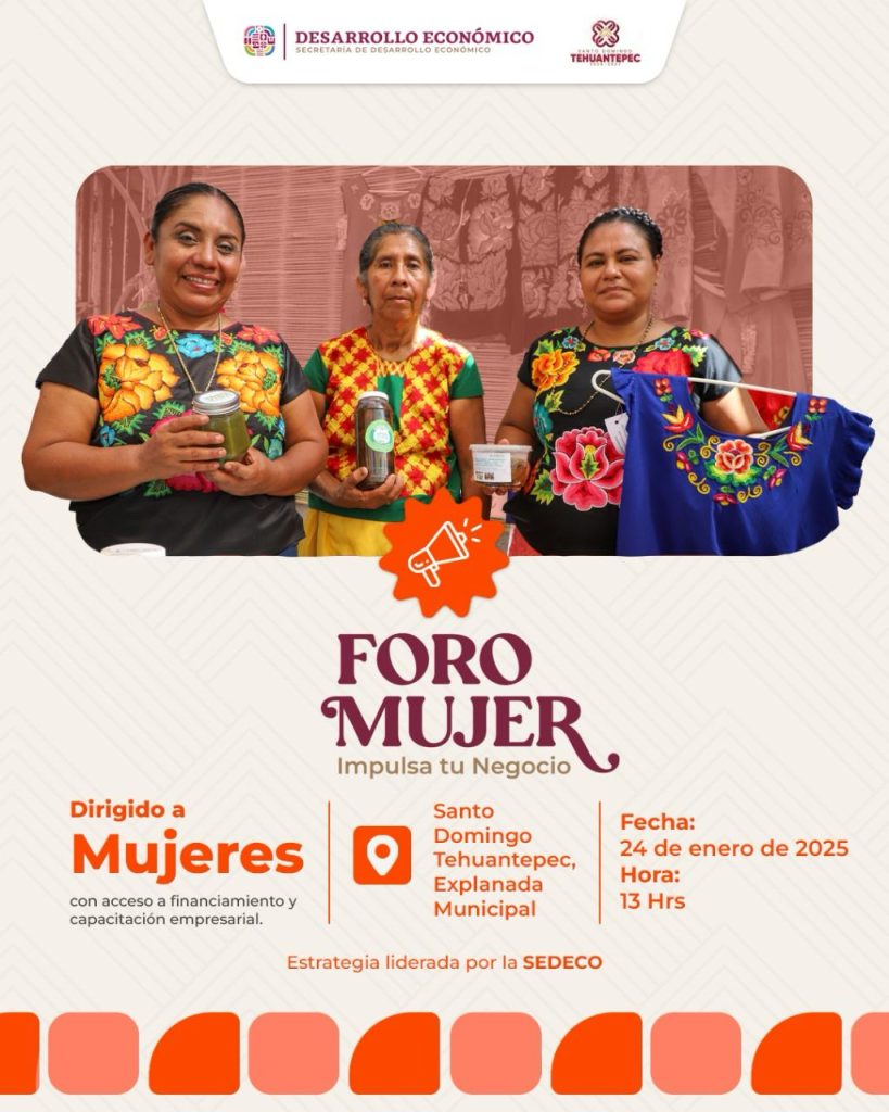 Oaxaca de Juárez, Oax. 18 de enero de 2025.- La Secretaría de Desarrollo Económico (Sedeco) invita a emprendedoras a participar en los foros Mujer Impulsa tu Negocio, que iniciarán el 24 de enero en Juchitán de Zaragoza y Santo Domingo Tehuantepec, a través de los cuales, alrededor de mil participantes recibirán capacitación para potenciar sus ventas, orientación sobre acceso a financiamiento preferencial y presencia en mercados nacionales.