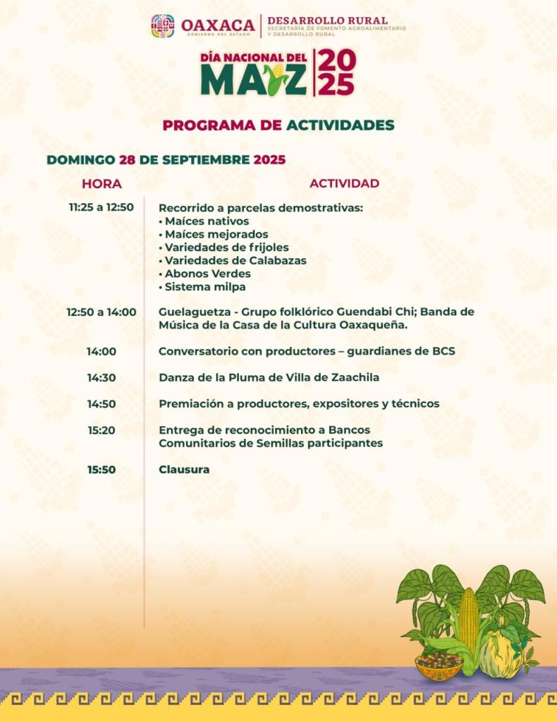 El Día Nacional del Maíz se conmemora cada 29 de septiembre desde su decreto en 2019; en este evento se rendirá tributo a las 35 razas nativas que existen en Oaxaca, estado con el 60 por ciento de la diversidad de este grano en todo México, que cuenta con 59 registradas.