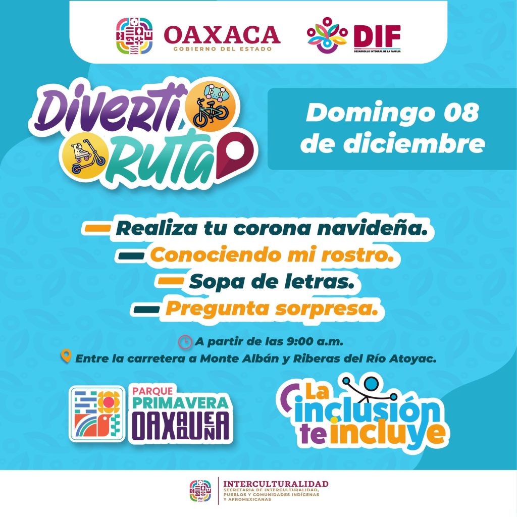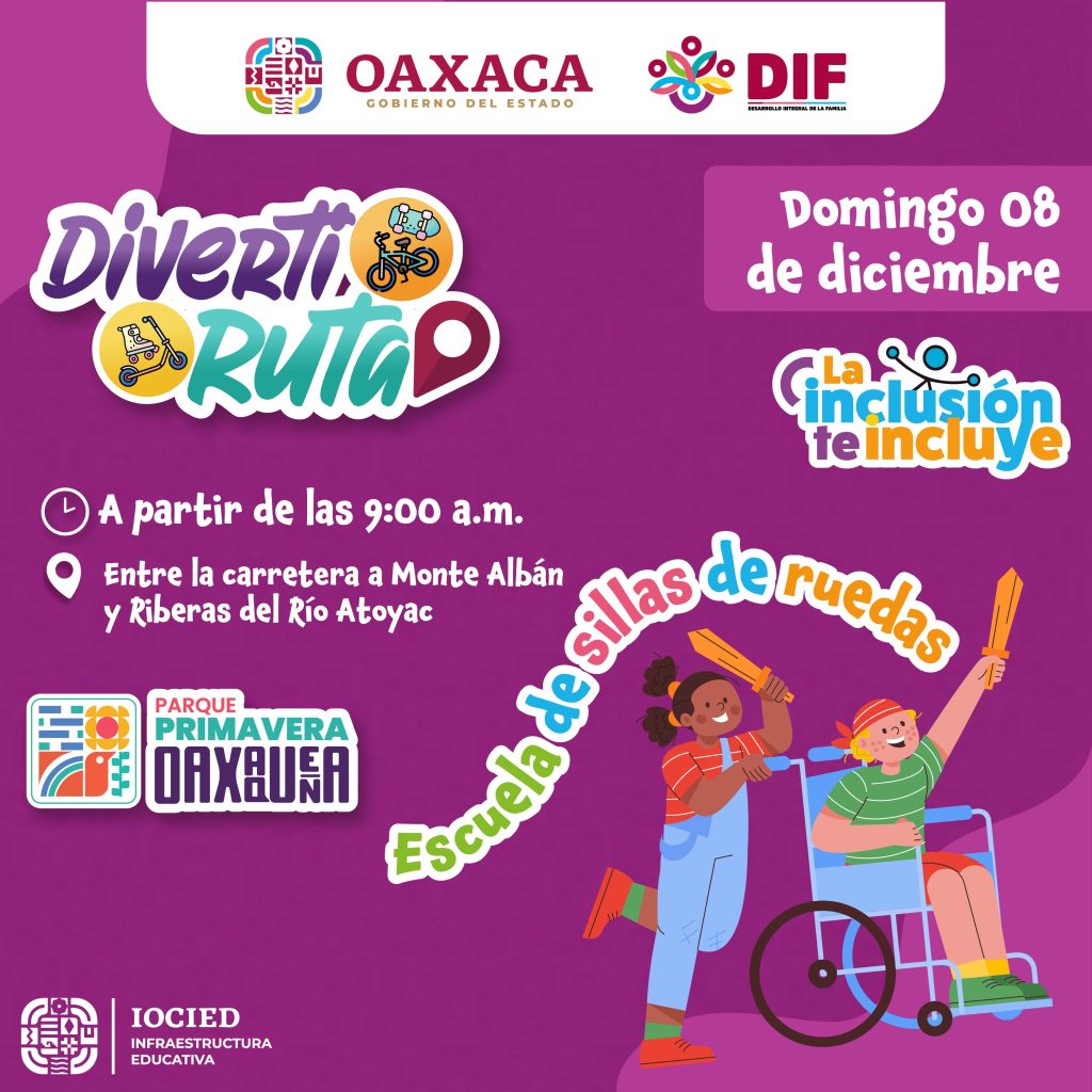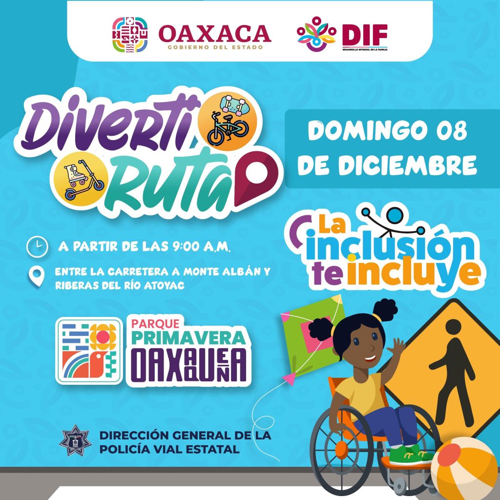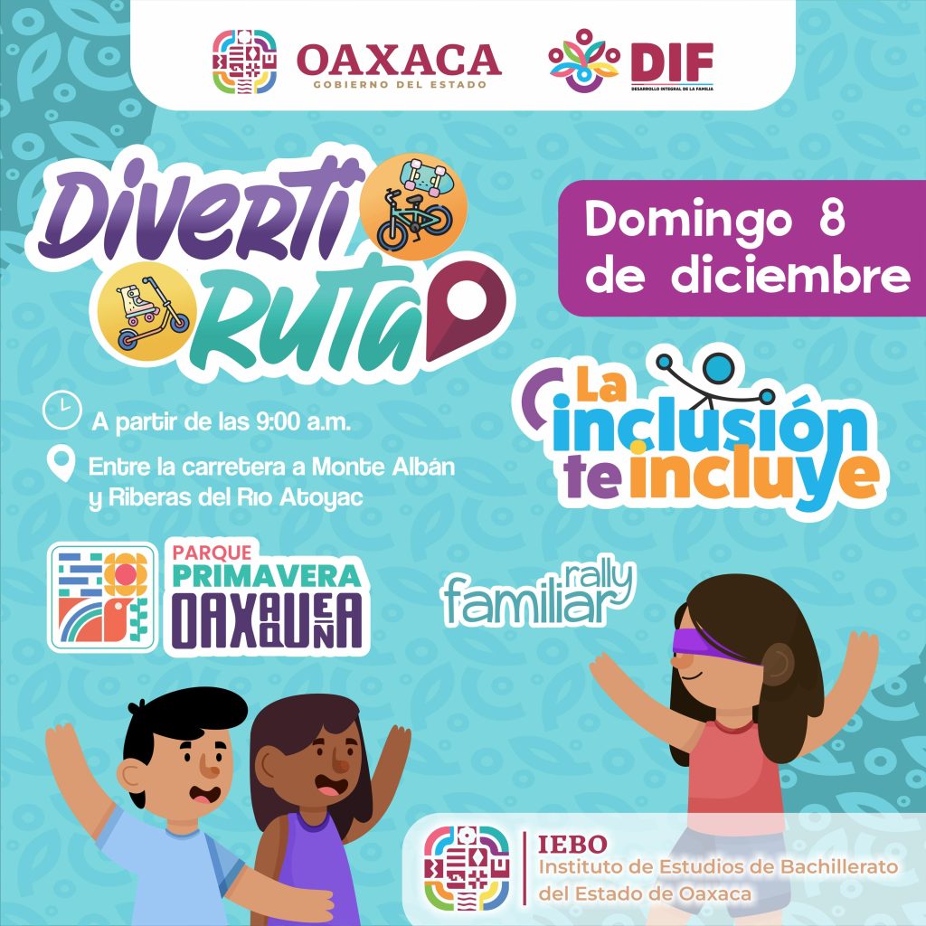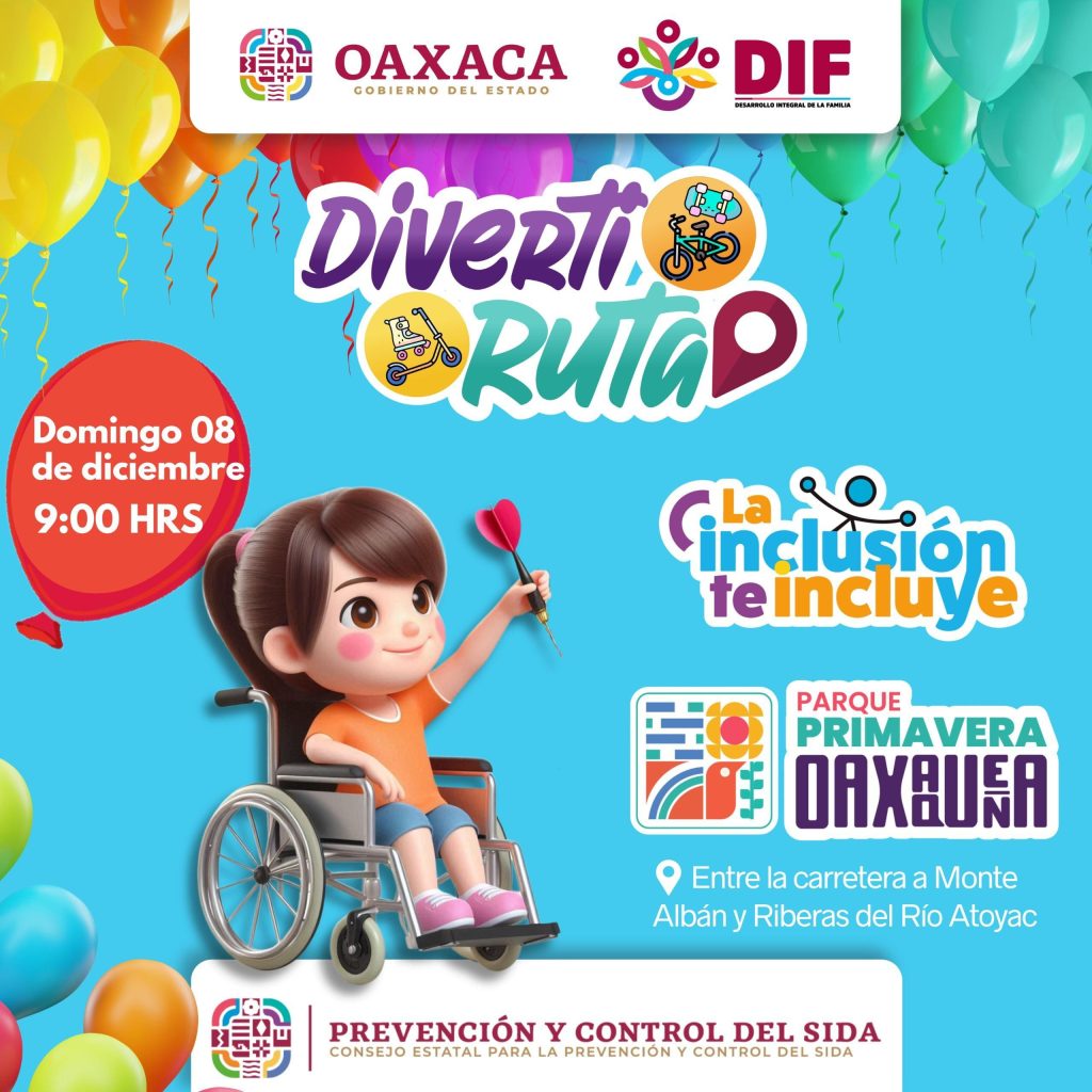 Oaxaca de Juárez, Oax. 6 de diciembre de 2024.- En el marco del Día Internacional de las Personas con Discapacidad, conmemorado cada 3 de diciembre, la vigésima séptima edición de la Diverti Ruta ofrecerá diversión y aprendizaje a la niñez y adolescencia con actividades recreativas, culturales y deportivas inclusivas este domingo 8 del presente mes en las instalaciones del Parque Primavera Oaxaqueña Cho Ndobá.