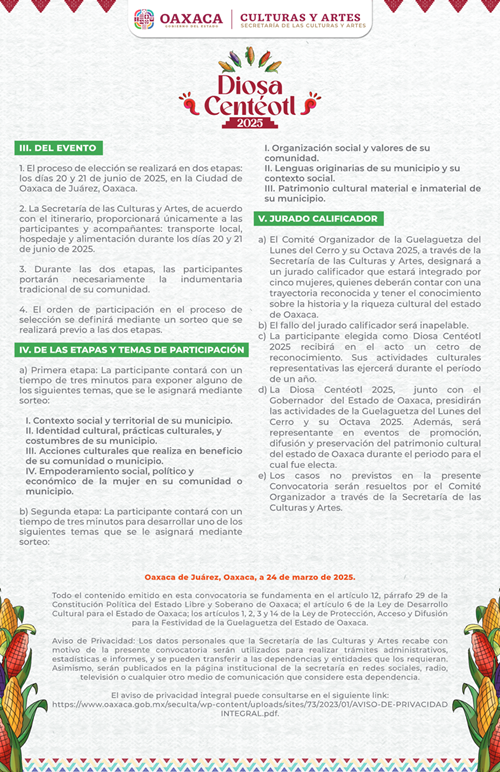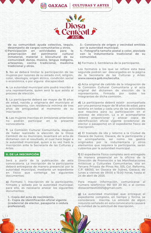 Los requisitos y formatos de inscripción se pueden consultar en la página oficial de la Secretaría de las Culturas y Artes a través del siguiente enlace: https://www.oaxaca.gob.mx/seculta/convocatoria-diosa-centeotl-2025/.