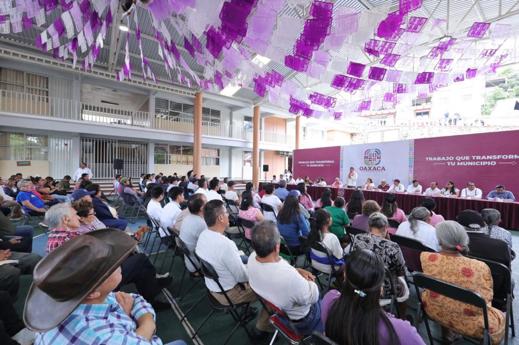 En su regreso por San Ildefonso Villa Alta, Jara Cruz recordó ante el público que en 2024 se favoreció a la agencia de Santa Catarina Yetzelalag con la construcción de 900 metros de un camino artesanal que va al municipio de Santiago Camotlán.