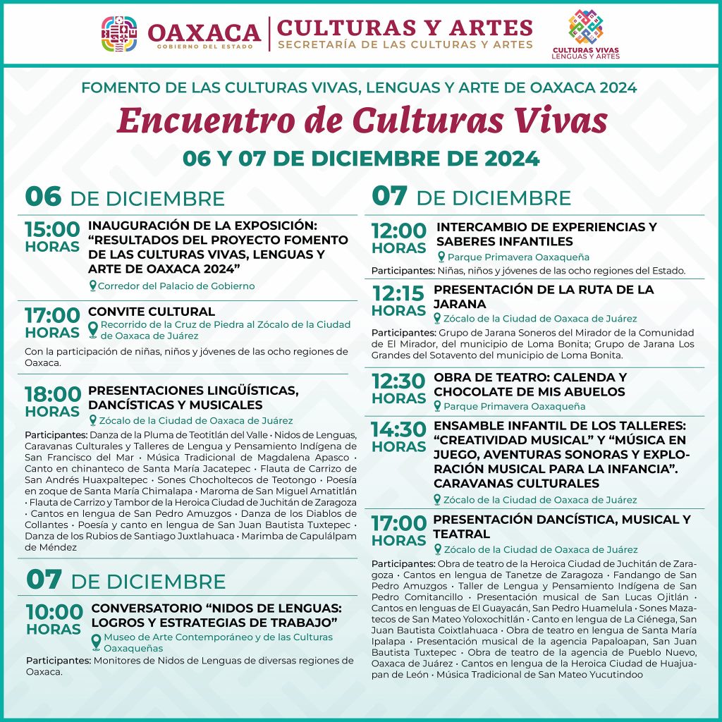 Por segundo año consecutivo, diversas sedes de la ciudad de Oaxaca serán los espacios para reunir los días 6 y 7 de diciembre a quienes forman parte del proyecto sexenal Culturas Vivas: Lenguas y Artes, y presentar actividades en el rescate y fomento de esta tradición oral.