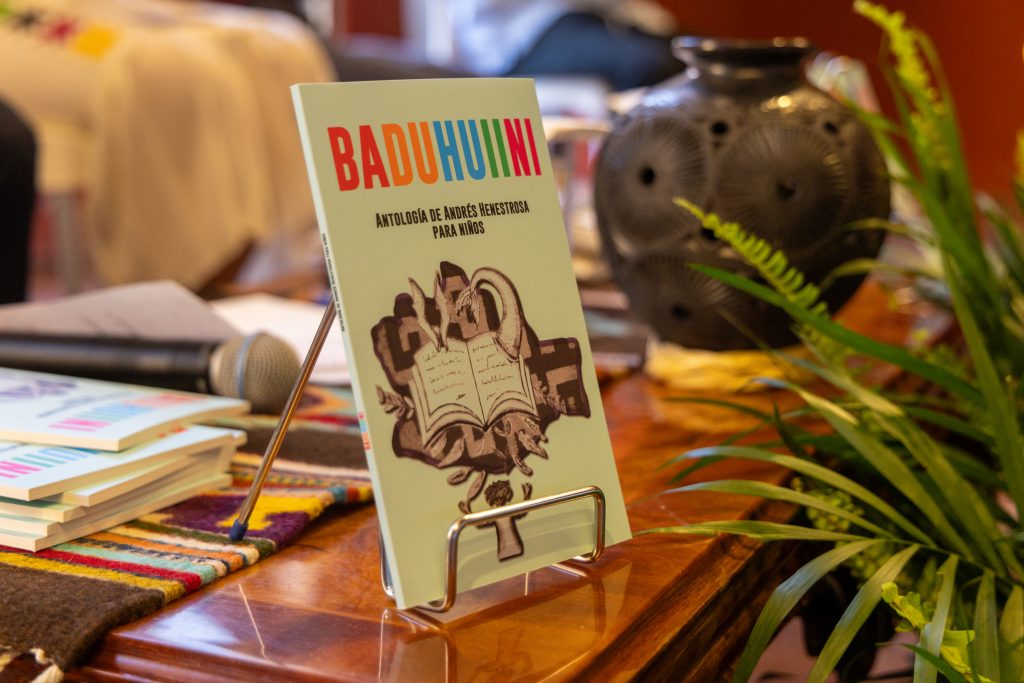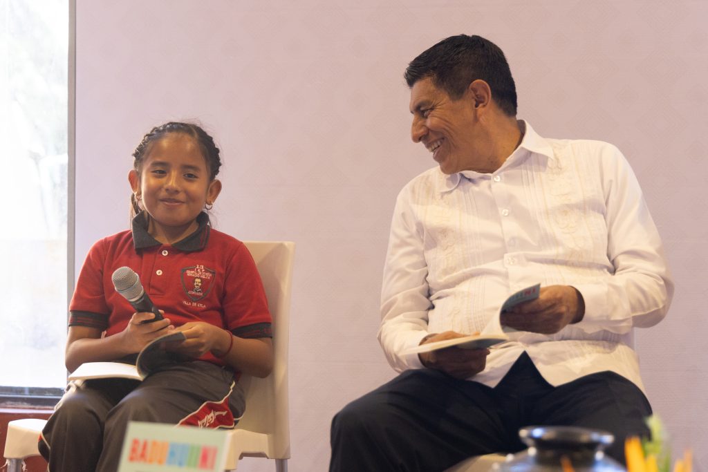 Durante el evento realizado en el Centro Cultural y de Convenciones de Oaxaca (CCO), el Mandatario estatal compartió con Harley, Quetzally y Erick pasajes de la obra Baduhuiini Antología de Andrés Henestrosa para niños, que promueve los valores y tradiciones de la cultura zapoteca.
