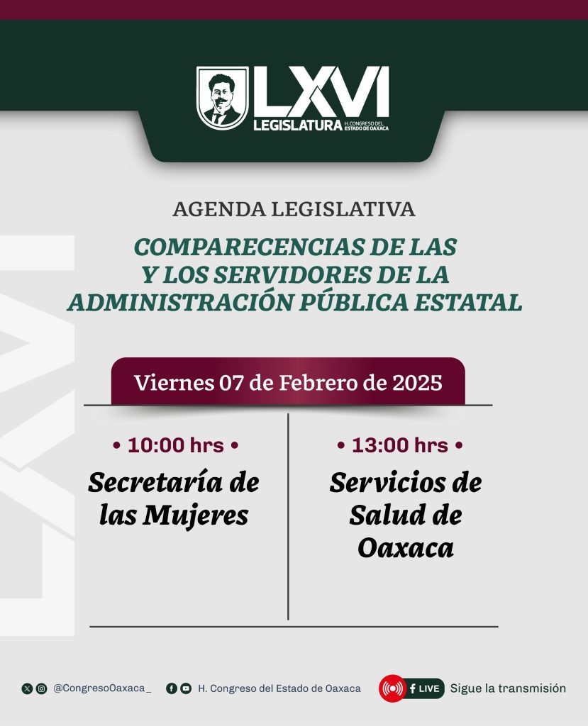 San Raymundo Jalpan, Oax., a 22 de enero de 2025.- En sesión ordinaria la Mesa Directiva de la LXVI Legislatura local informó el acuerdo de la Junta de Coordinación Política (Jucopo) por el que se reprograman tres #comparecencias de las y los titulares de la Administración Pública Estatal.