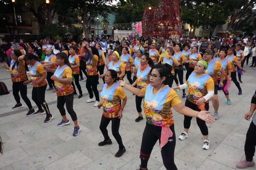 El espectáculo deportivo denominado “El Gigante del Dance Fitness” congregó a las y los participantes en la Alameda de León de Oaxaca de Juárez, quienes disfrutaron de una tarde saludable al ritmo de cumbia, salsa, reguetón, bailes regionales, entre otros géneros.