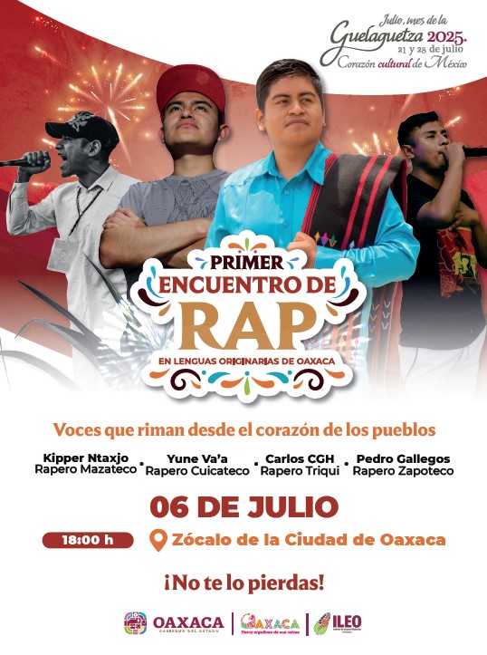 El domingo 6 de julio, el Zócalo de la ciudad capital vibrará con el Primer Encuentro de Rap en lenguas originarias de Oaxaca “Voces que riman desde el corazón de los pueblos”.